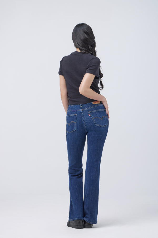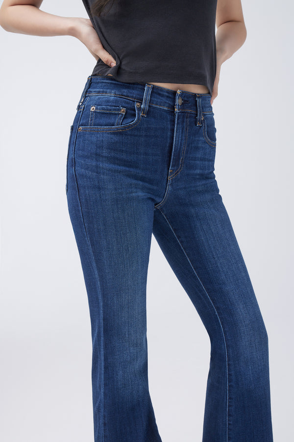 Fits through the hip and thigh, flares through the calf and ankle, flatters the whole way through.