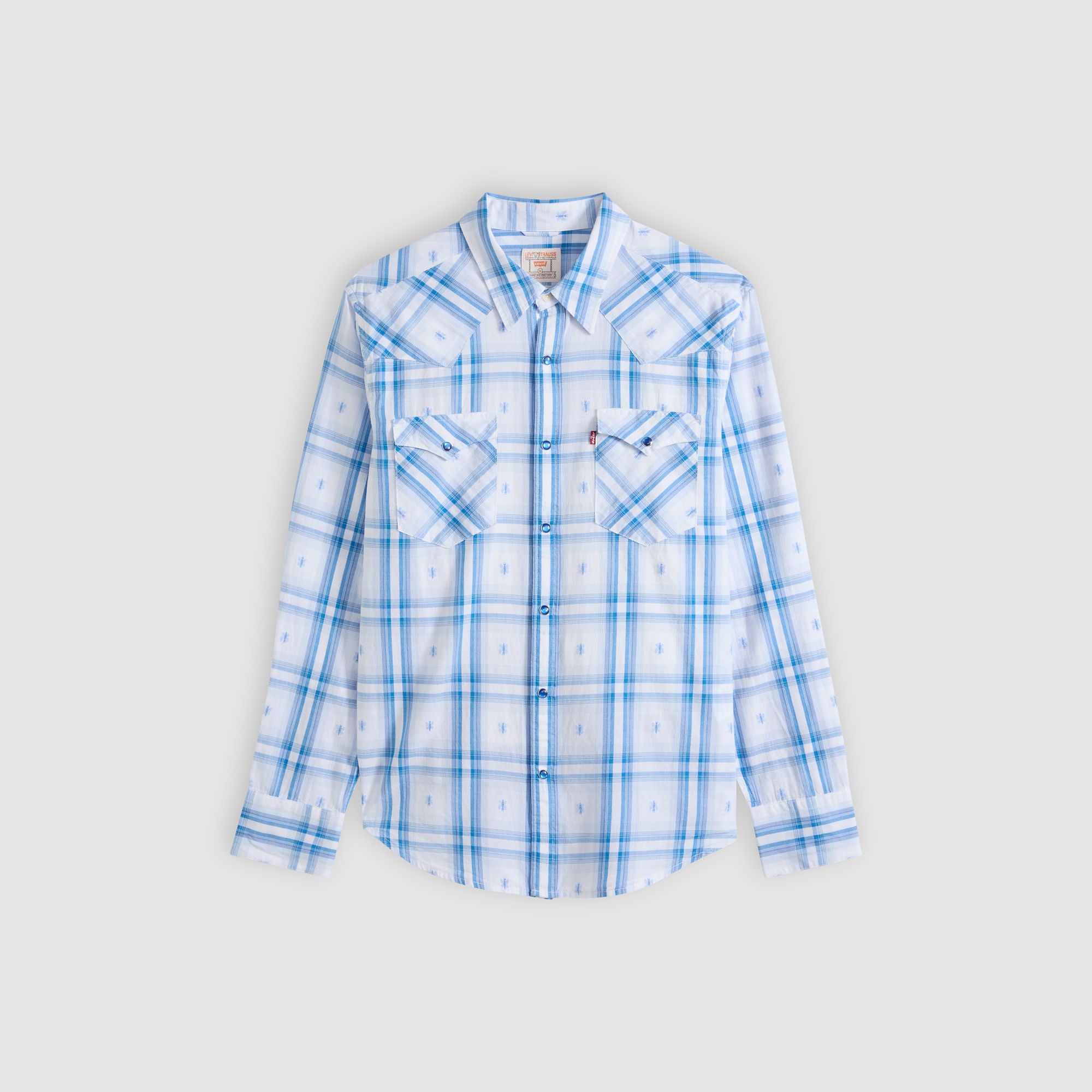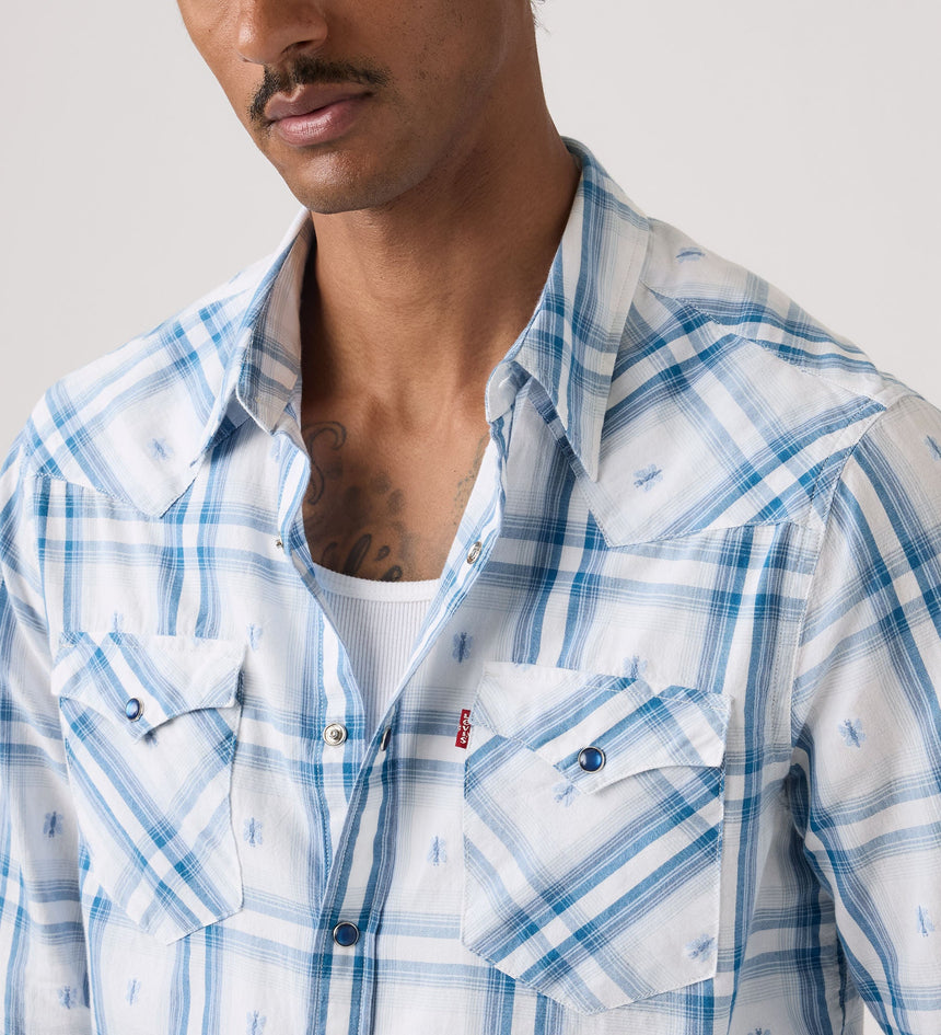 미국 서부 문화에 뿌리를 둔 리바이스의 클래식 웨스턴 셔츠로 스냅 버튼 플래킷과 포인티드 요크 디테일이 특징입니다.