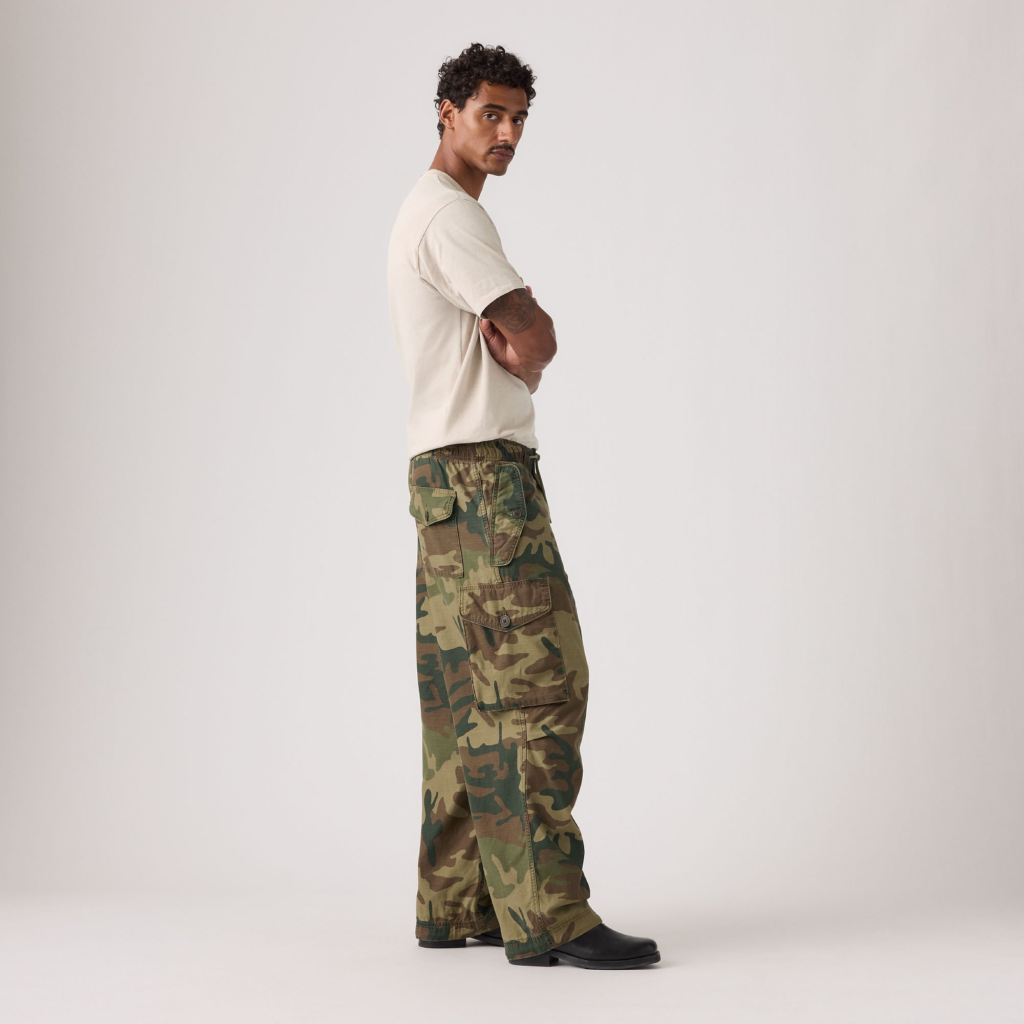 유틸리티 팬츠를 재해석하여 넉넉한 배기핏과 다양한 포켓을 더했습니다.