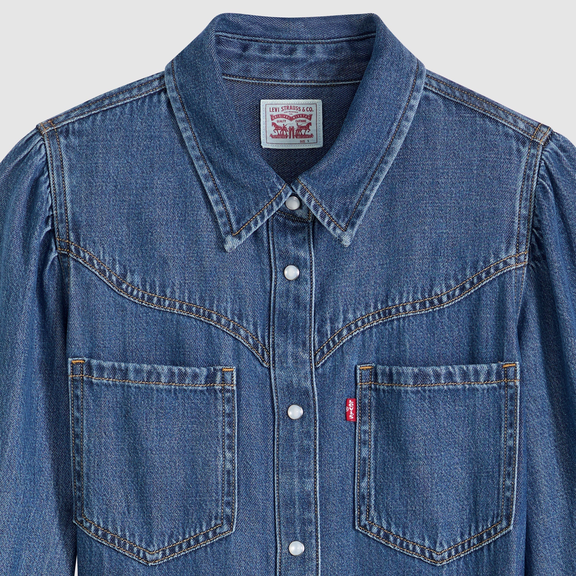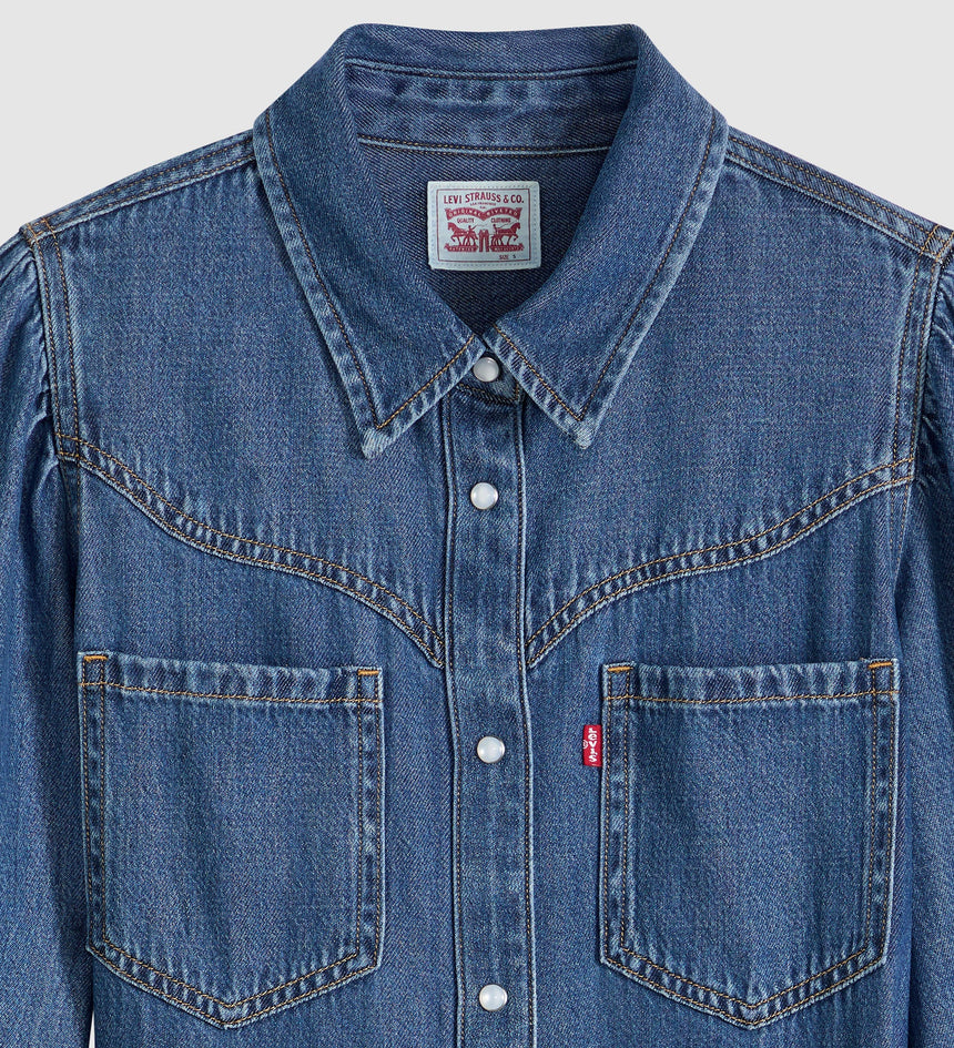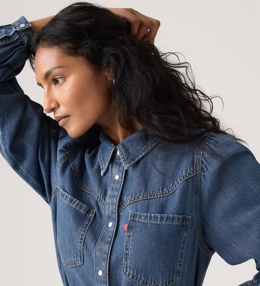 빈티지한 웨스턴 무드에 버튼업과 허리 끈 디테일을 더했습니다.