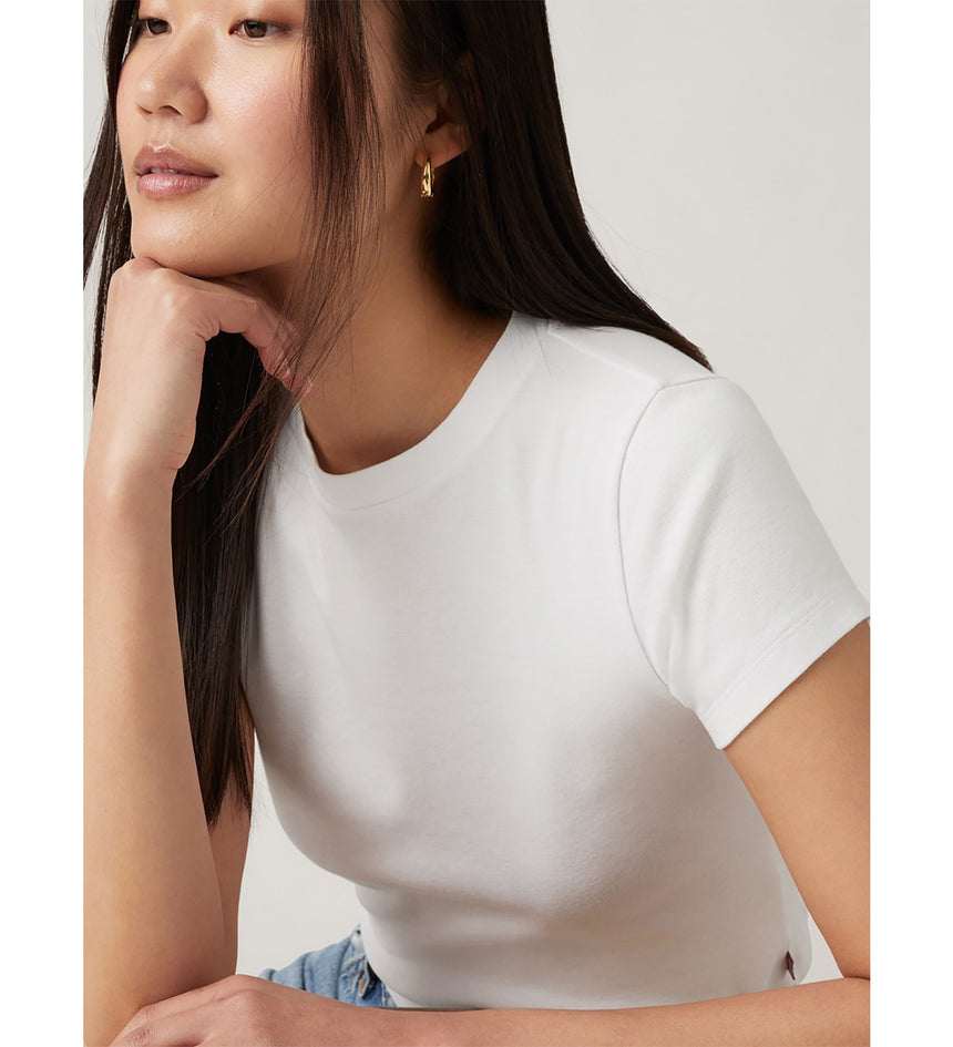 유행을 타지 않은 디자인으로, 높은 넥라인과 크롭한 길이감이 특징인 제품입니다.