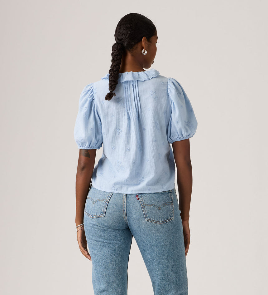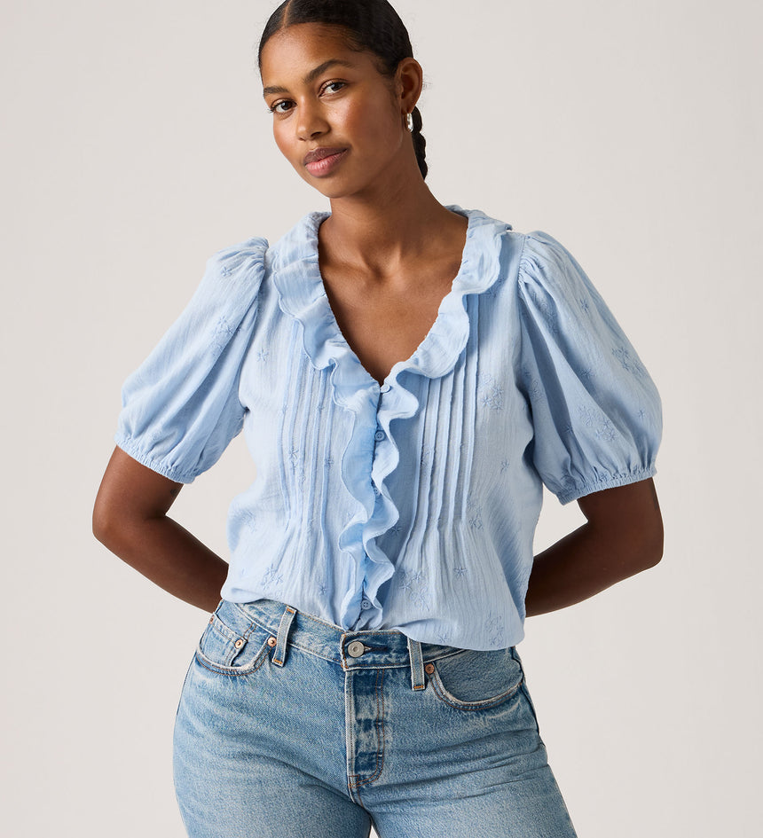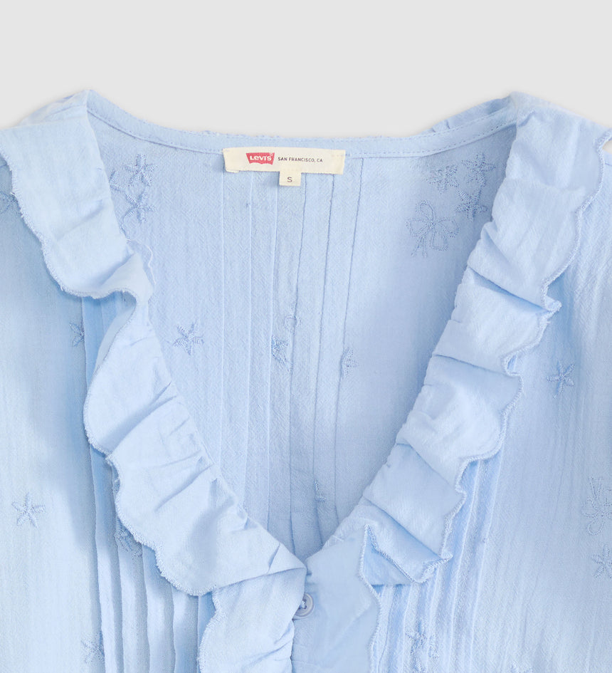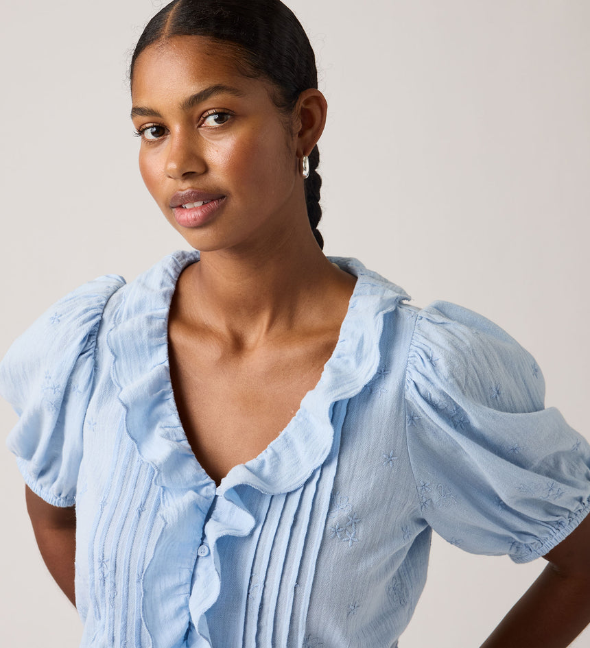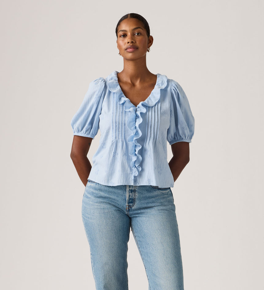 부드러운 스쿱 넥 라인에 러플 디테일을 더해 여성스러운 분위기를 연출합니다.