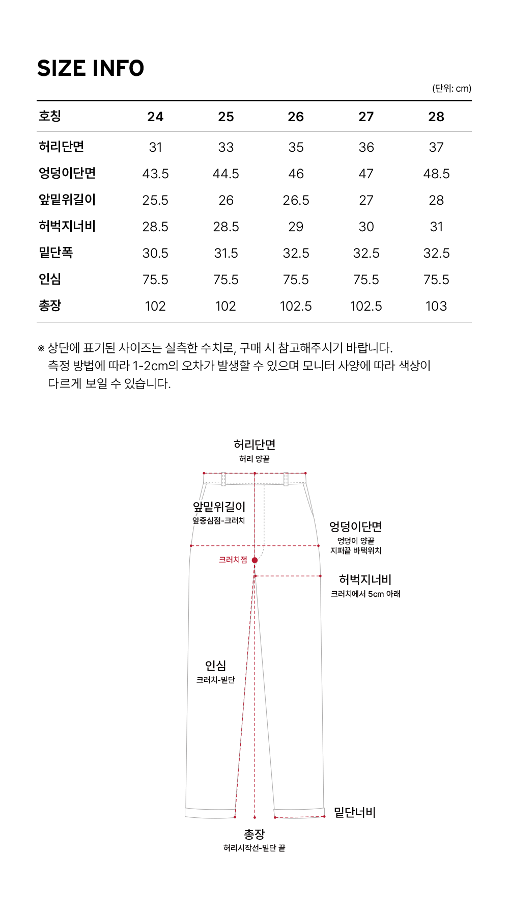 깔끔한 와이드 레그와 하이 라이즈 그리고 약간의 신축성을 갖추어 편안하면서도 날씬해 보이는 핏입니다.