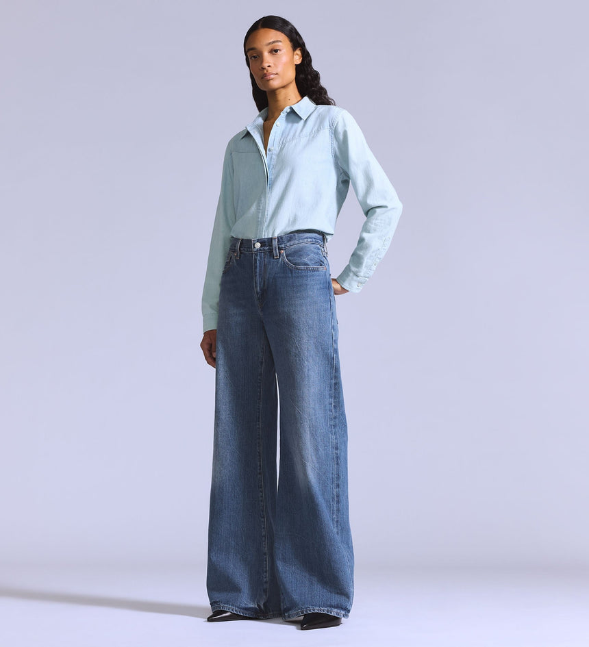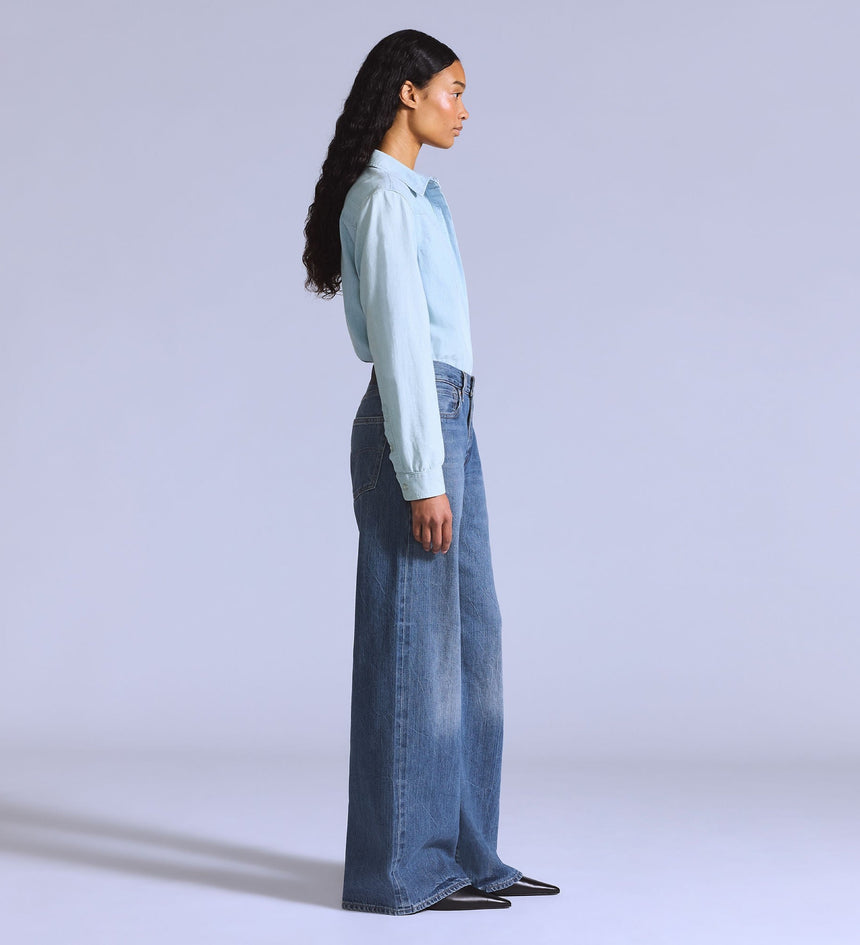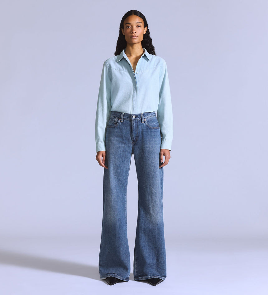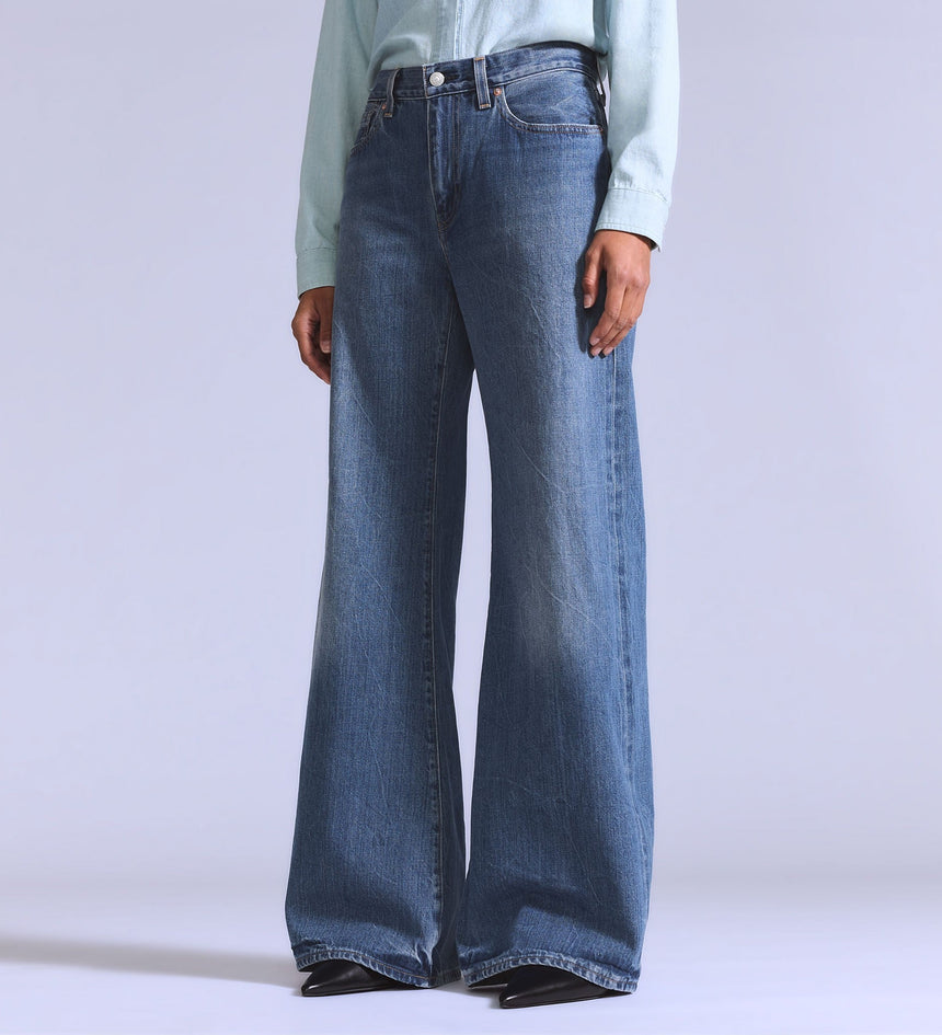 특별함이 느껴지는 미드라이즈 진으로 허벅지부터 무릎까지 곡선형으로 컷팅되어 넓게 퍼지는 플레어 레그 실루엣을 연출합니다