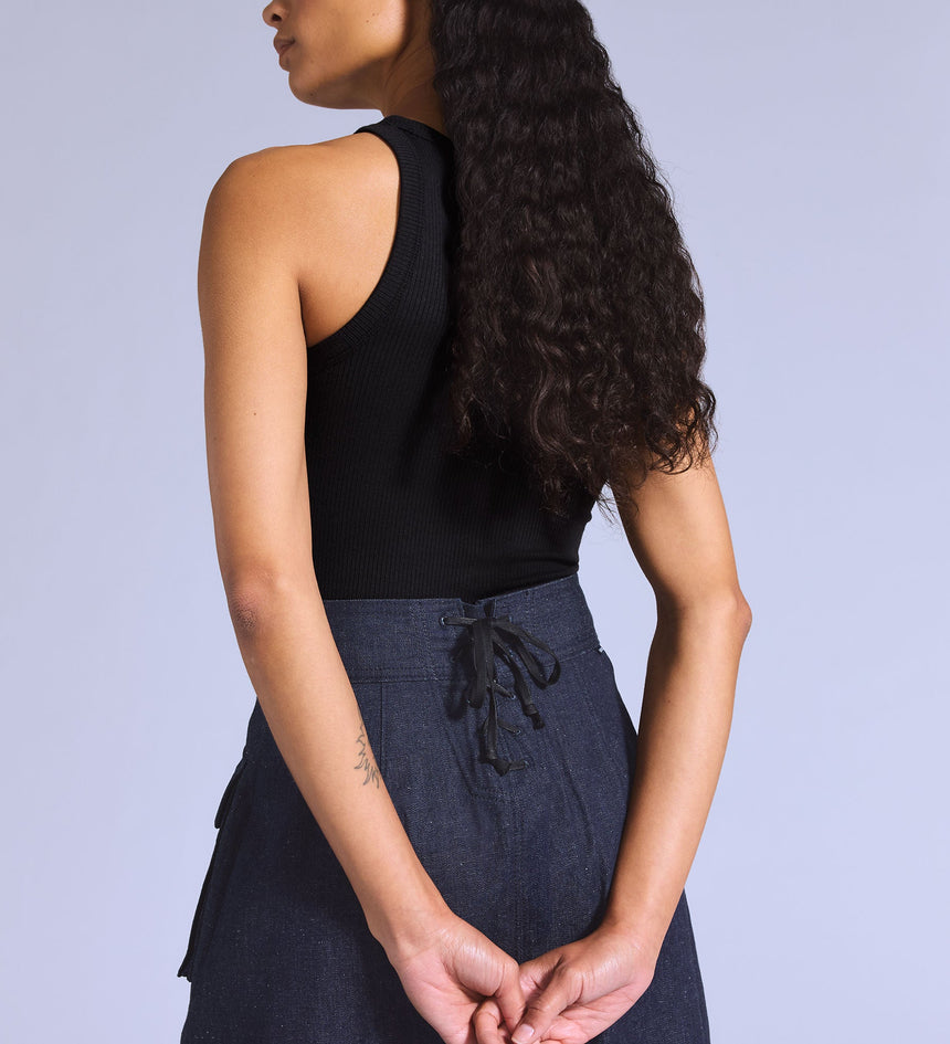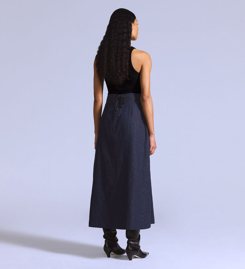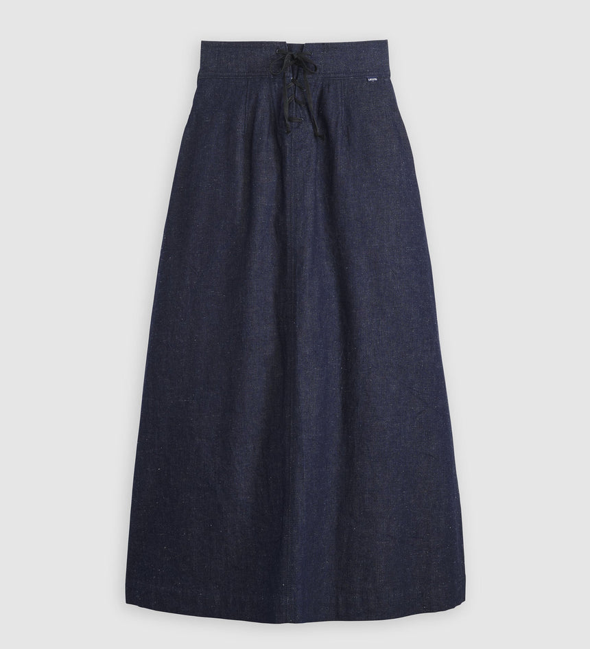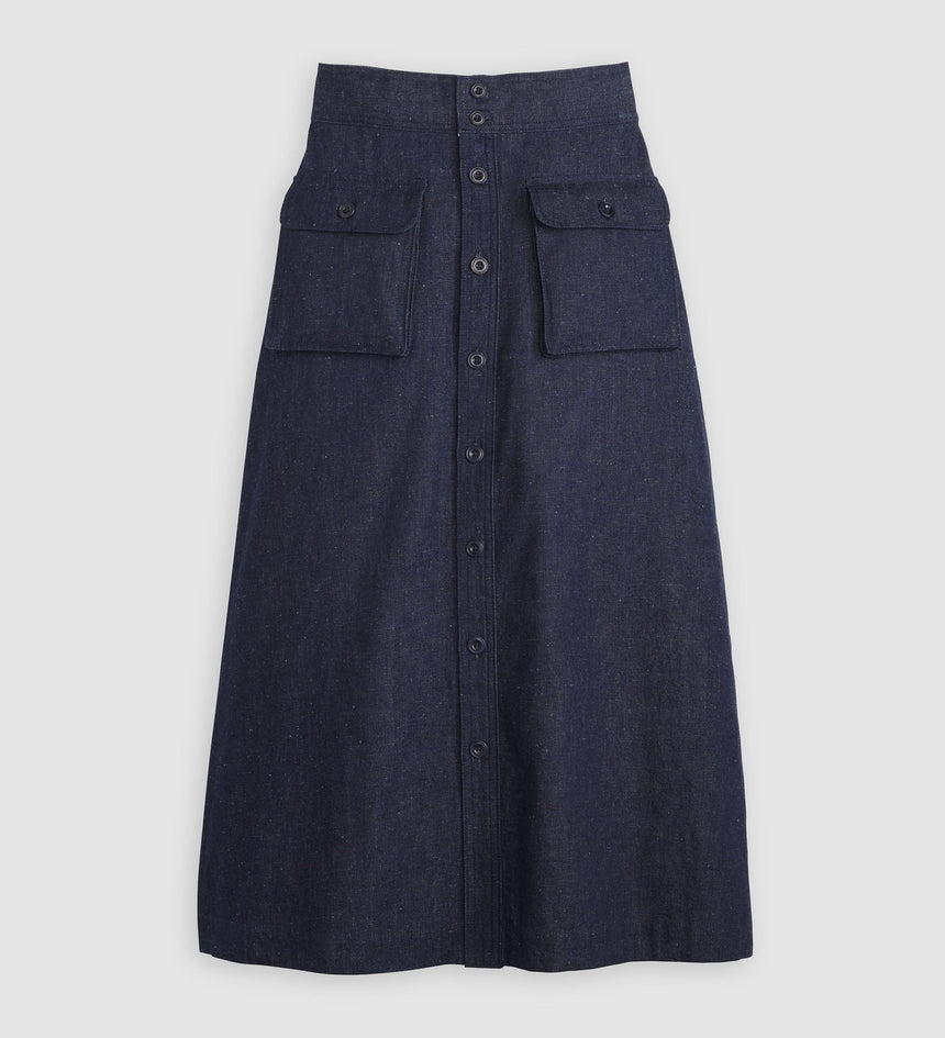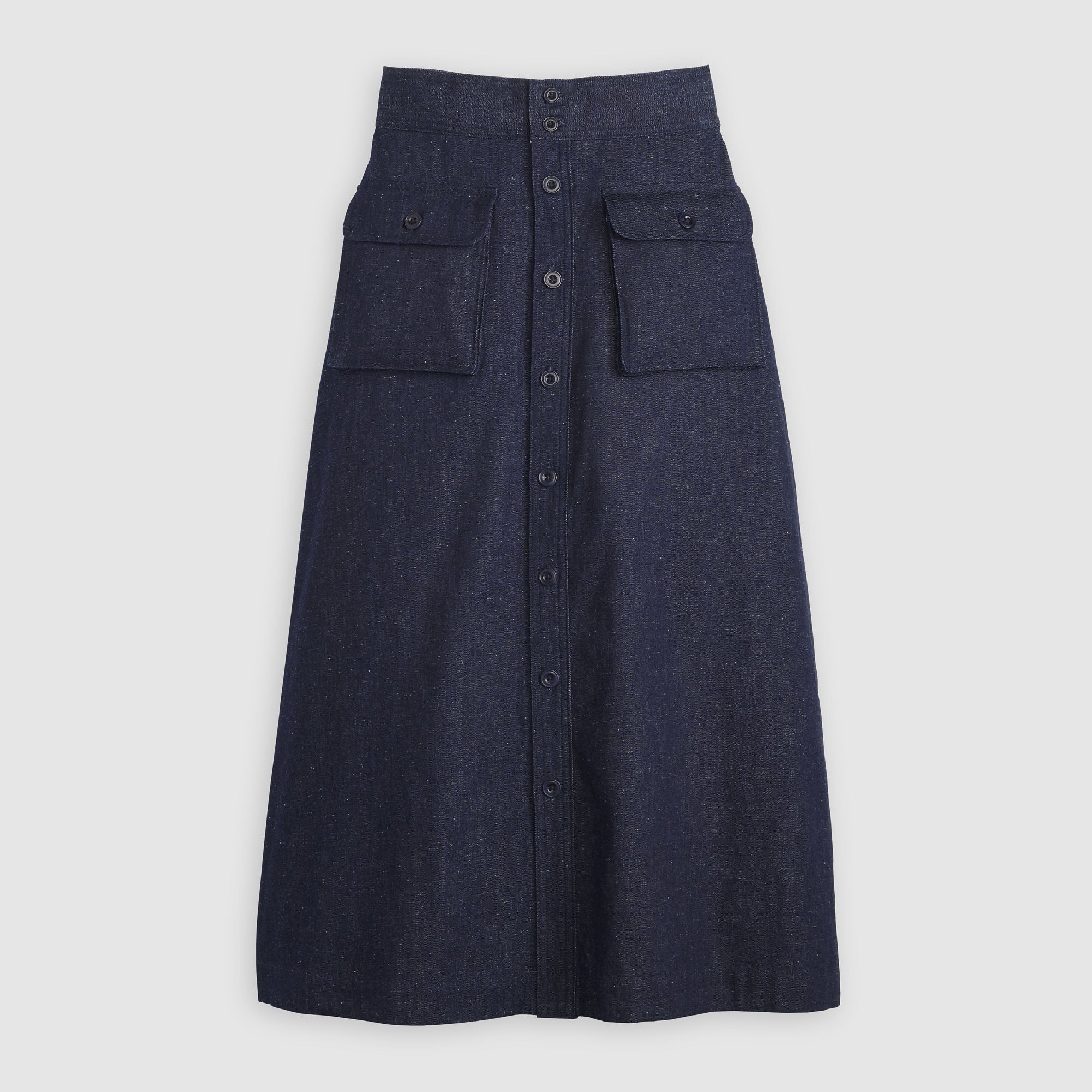 A라인 실루엣에 하이라이즈로 디자인되었고, 버튼업 프론트와 두 개의 패치 포켓이 특징입니다.