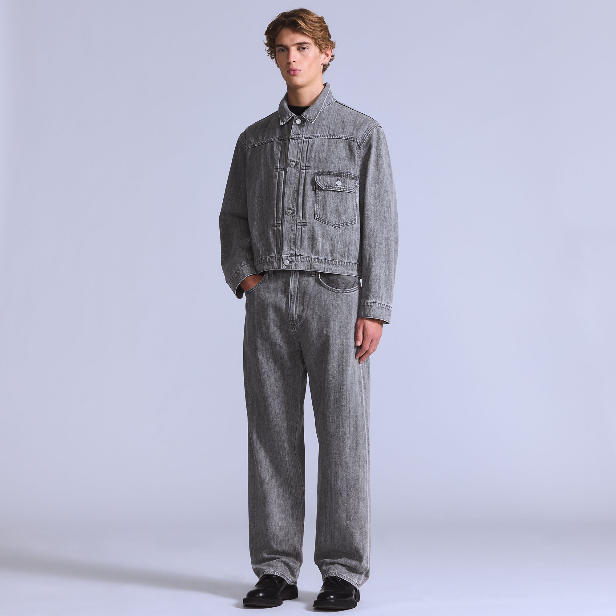 배기핏에 루즈한 실루엣으로 현대적인 테일러드 룩을 연출합니다.