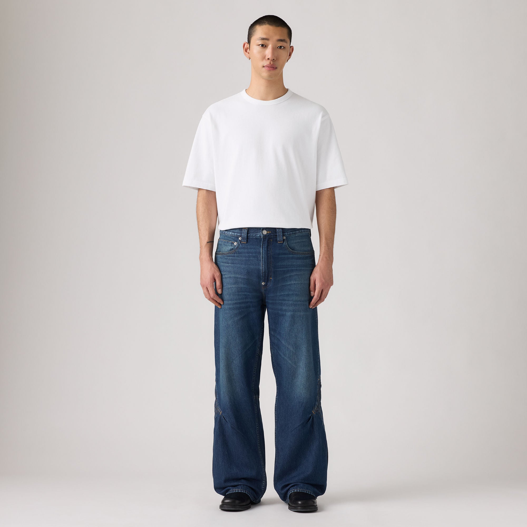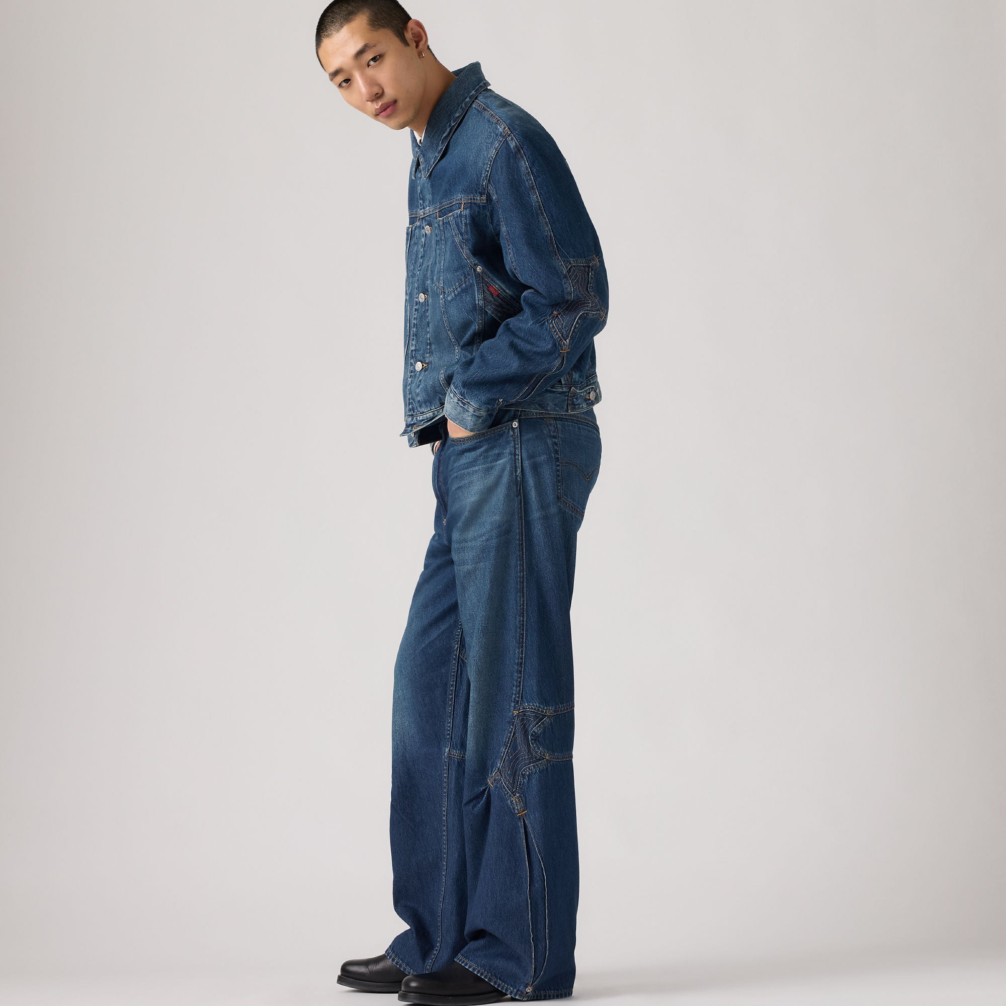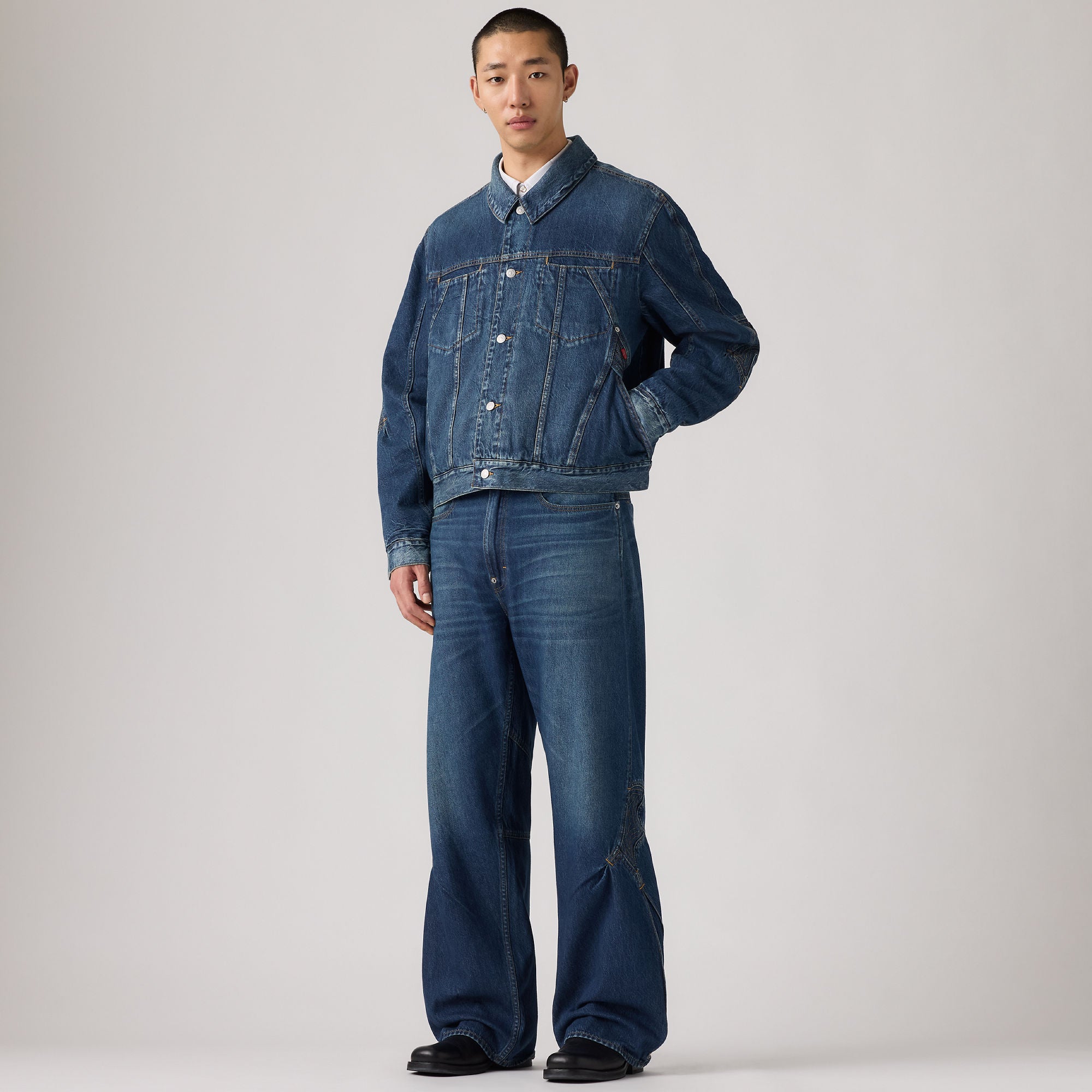 투톤 스티칭이 돋보이며 클래식 논스판 인디고 데님으로 만들어졌습니다.