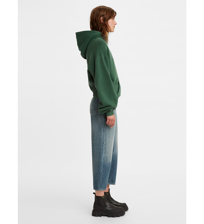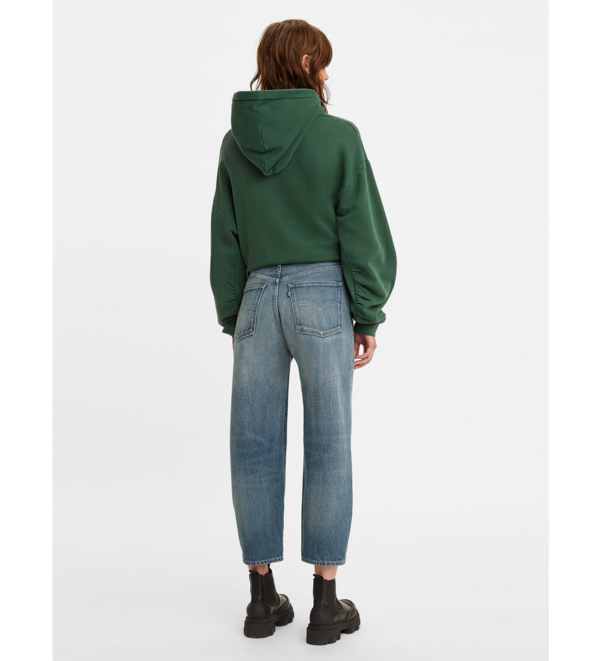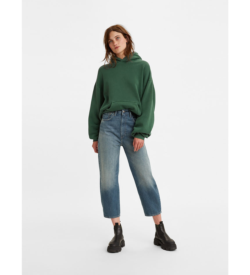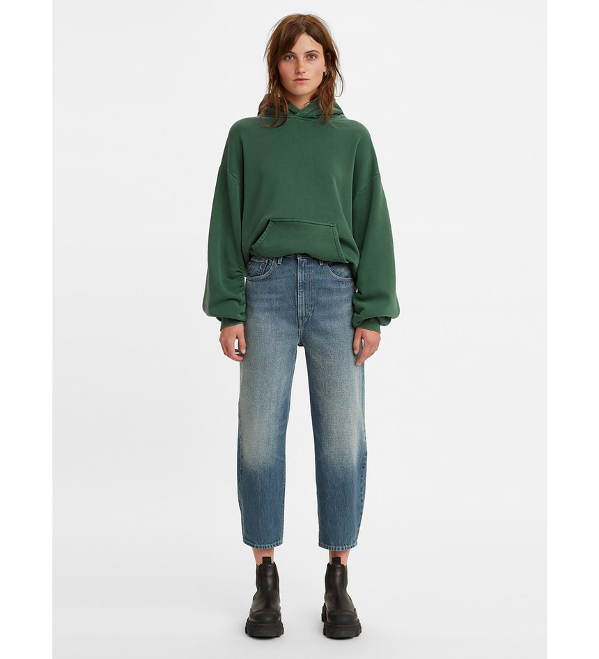 빈티지 501 오리지널 진을 오버사이즈로 스타일리시하게 착용하는 사람들에게 영감을 받아, 허리 라인은 강조되어 커브드 실루엣을 연출합니다. 중간 밝기의 어센틱 워싱과 중앙 부분에 크리즈 처리가 되어있어 차별화된 포인트가 됩니다.