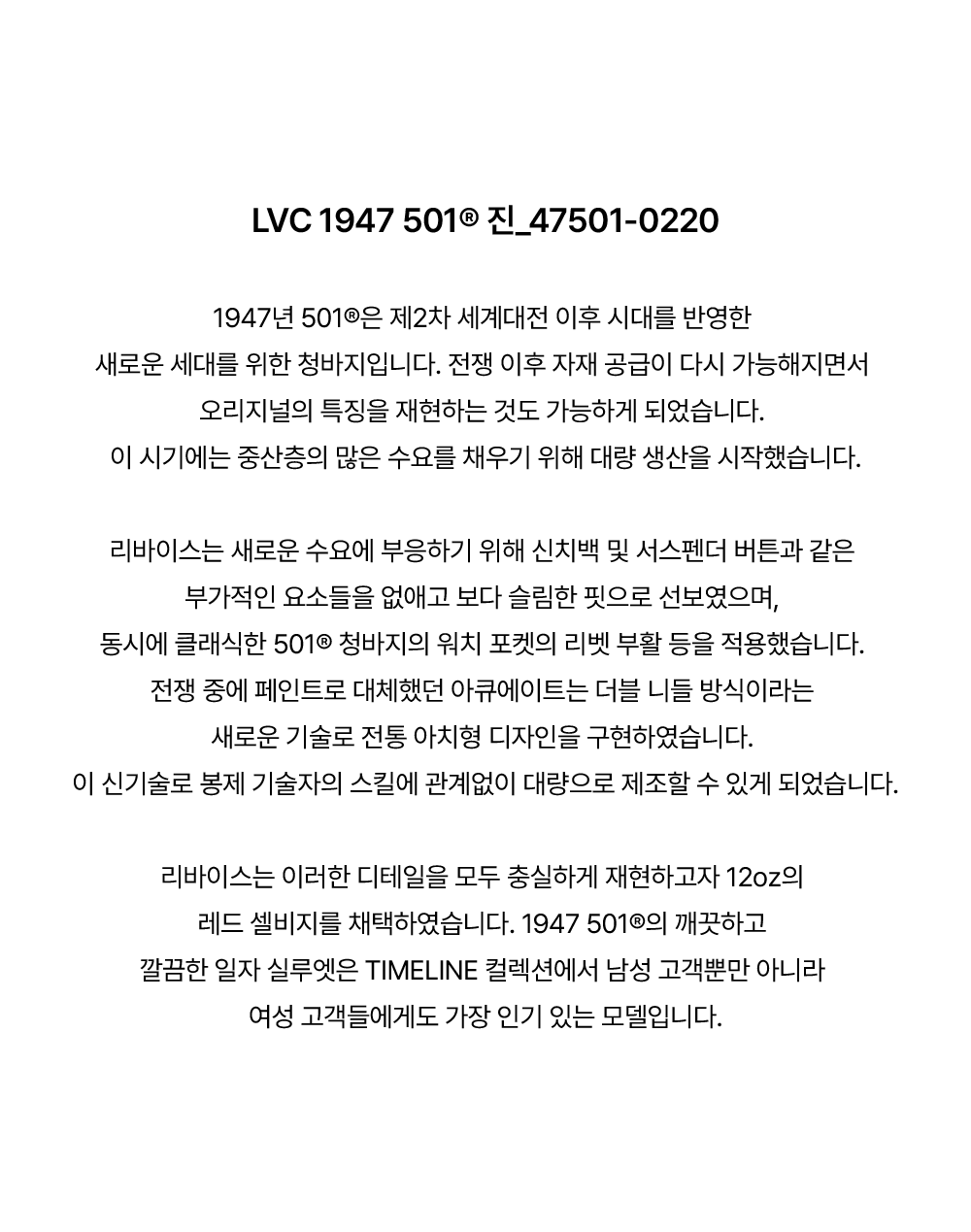 리바이스는 이러한 디테일을 모두 충실하게 재현하고자 12oz의 레드 셀비지를 채택하였습니다. 1947 501의 깨끗하고 깔끔한 일자 실루엣은 TIMELINE 컬렉션에서 남성 고객뿐만 아니라 여성 고객들에게도 가장 인기 있는 모델입니다.