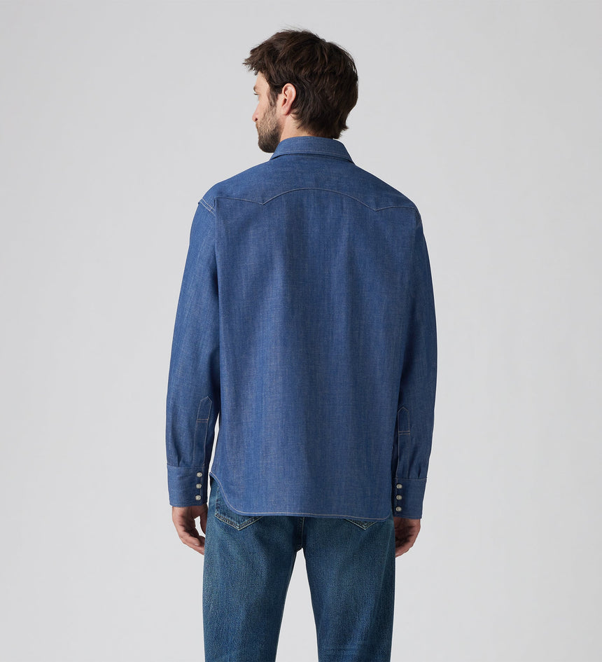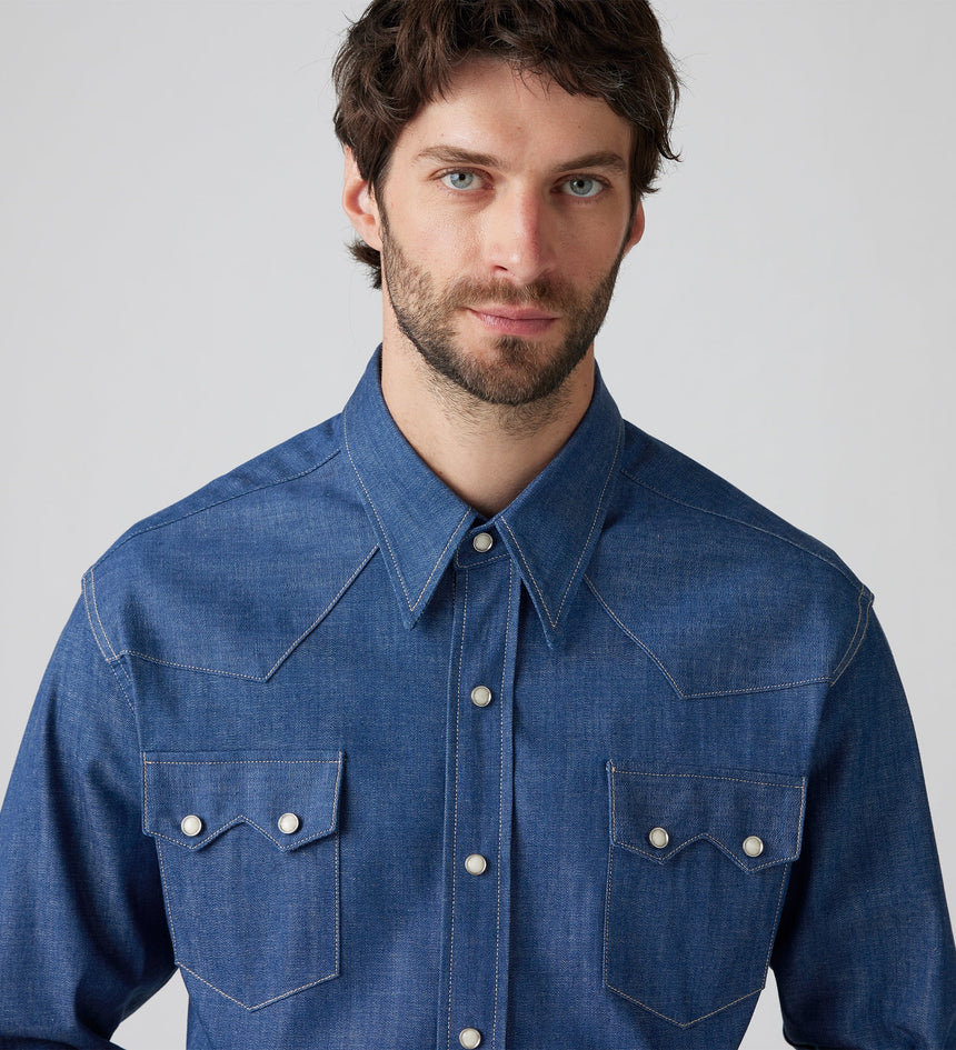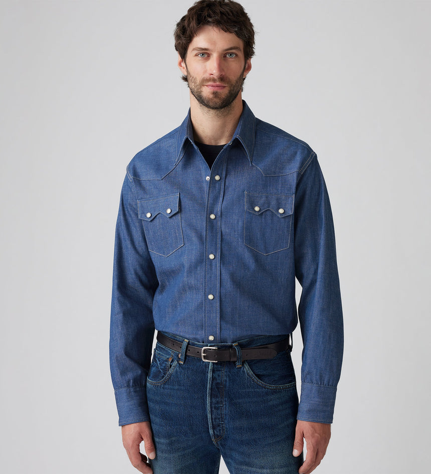 이 아이코닉한 LVC 1955 쇼트혼 소우투스 셔츠는 레귤러 핏, 자개 스냅 버튼, 웨스턴 요크 디테일,