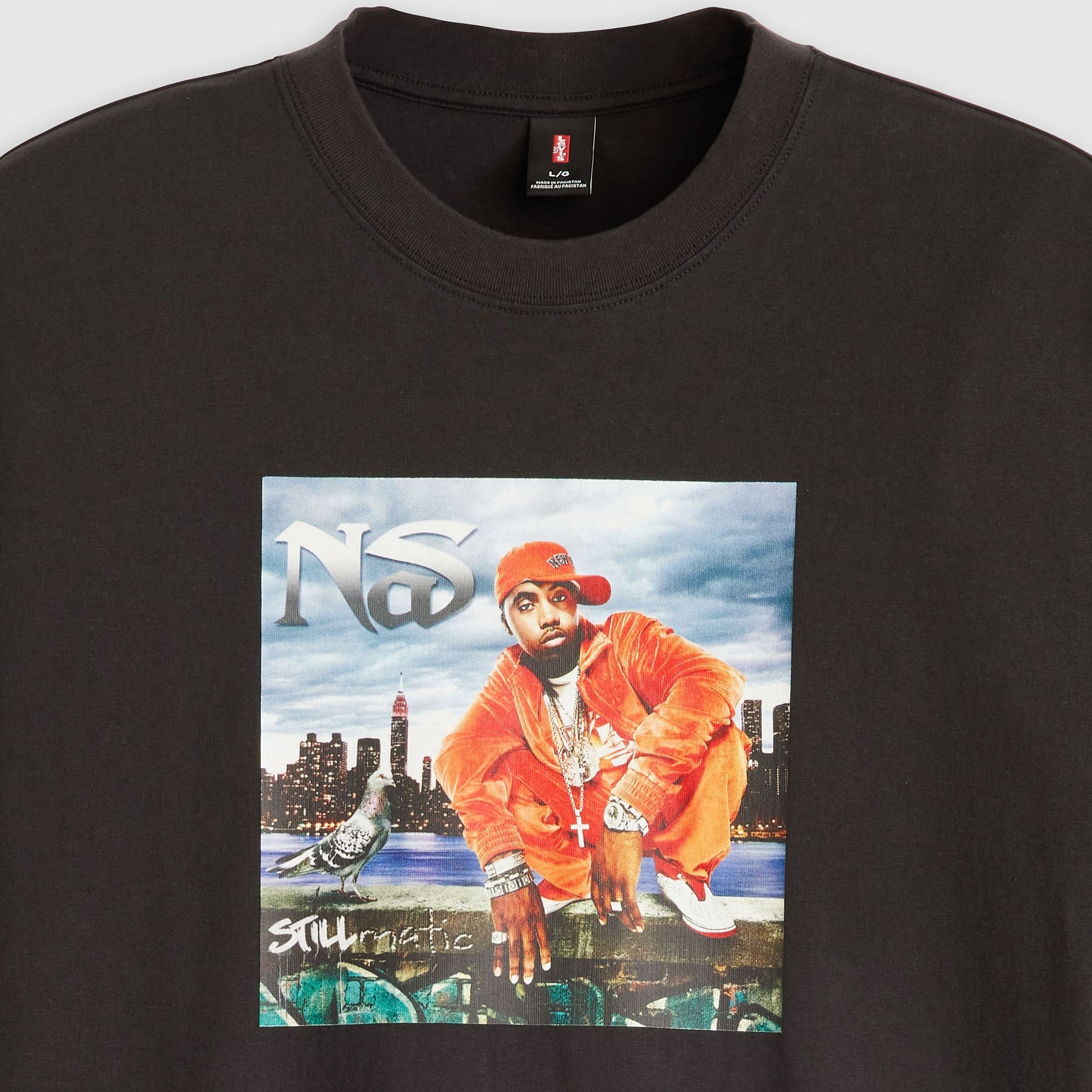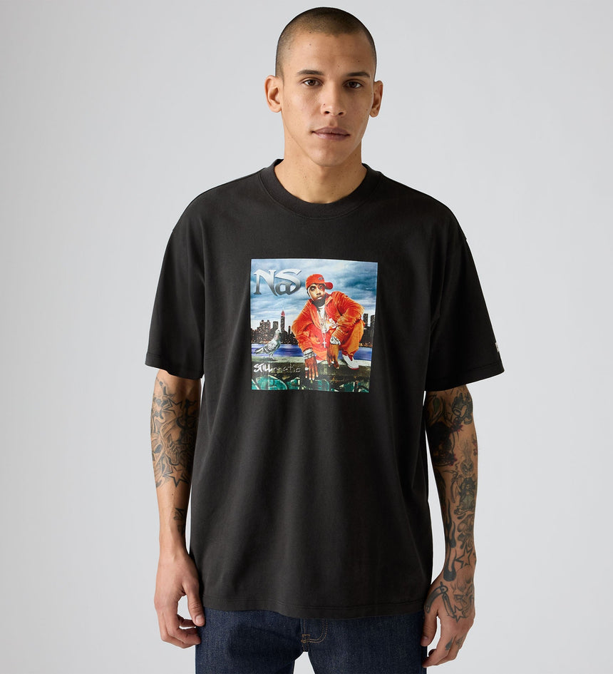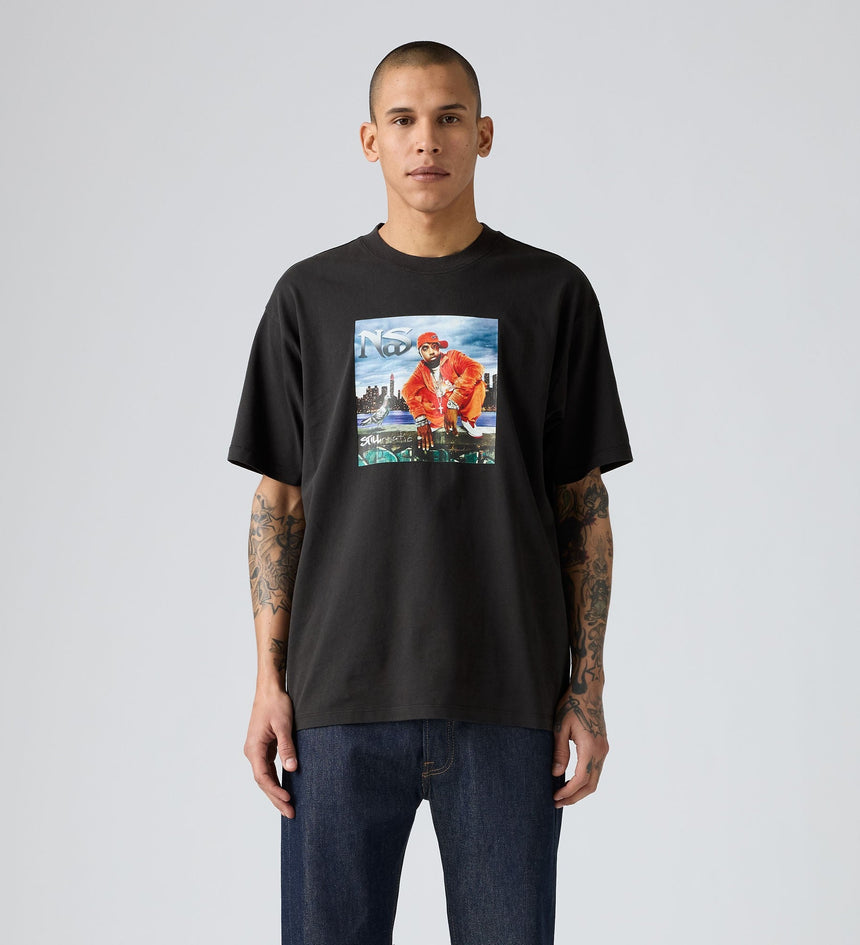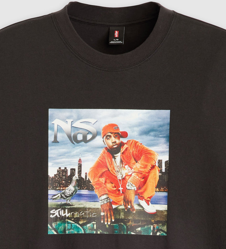 클래식한 크루넥과 여유 있는 핏에 나스 그래픽 디자인이 특징입니다.