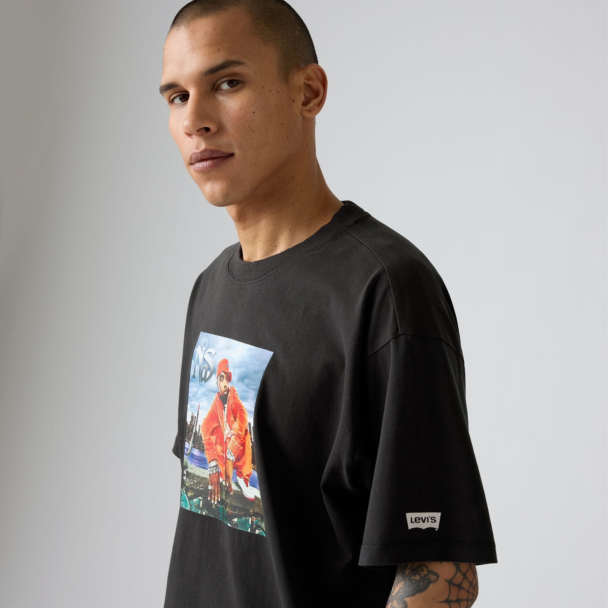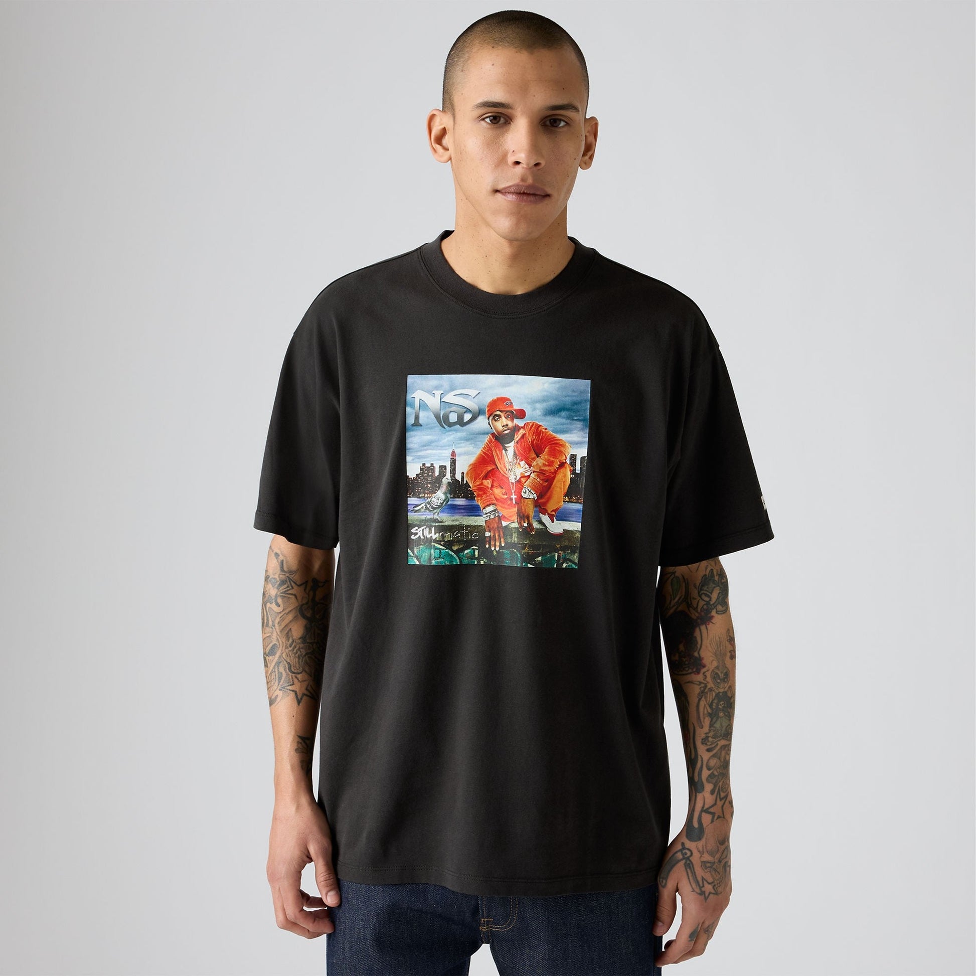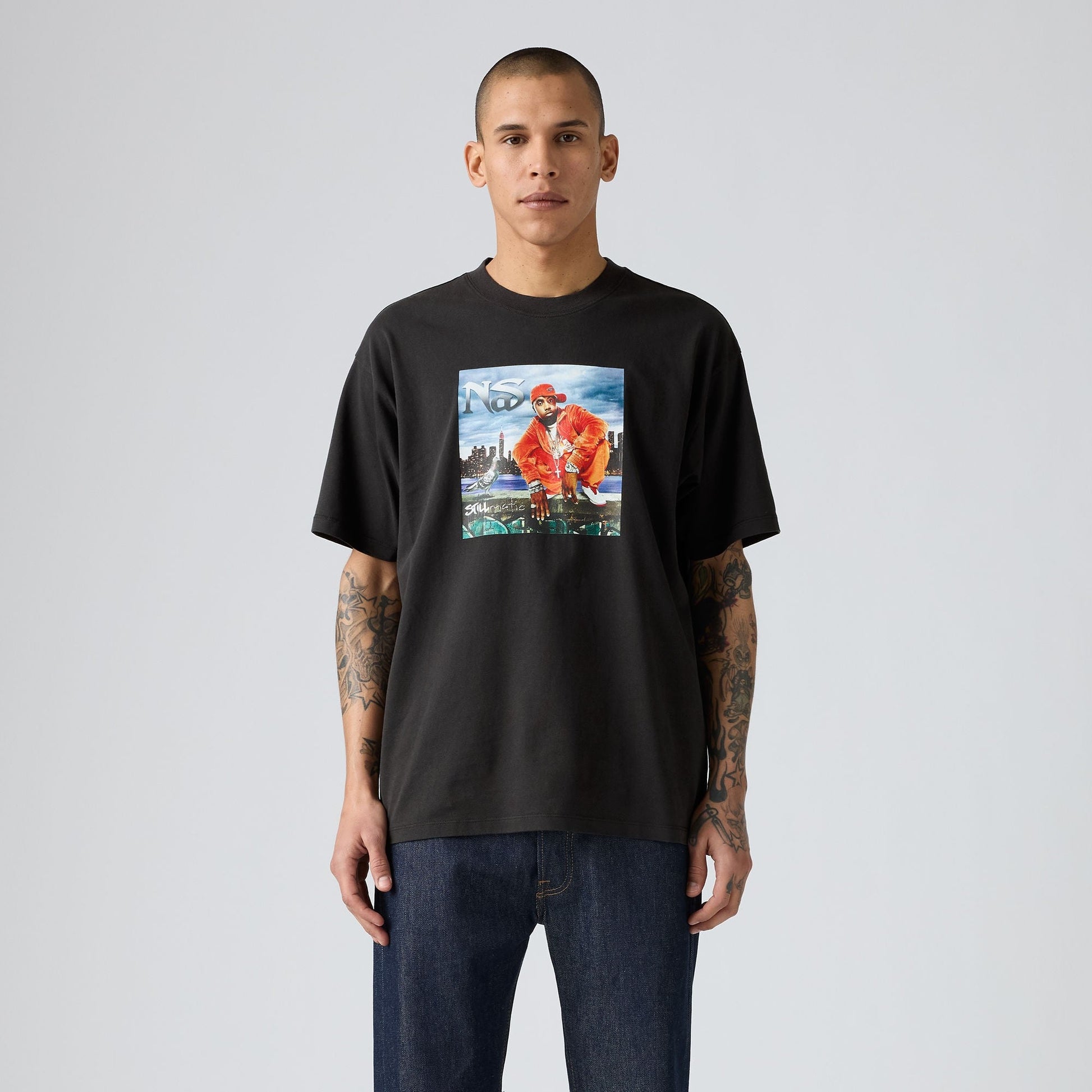 클래식한 크루넥과 여유 있는 핏에 나스 그래픽 디자인이 특징입니다.